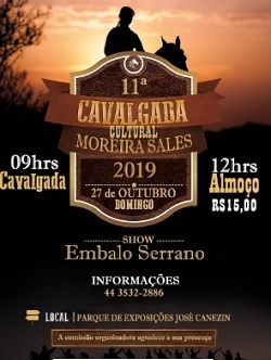 Moreira Sales - Acontece neste domingo (9h) a 11.a Cavalgada Cultural. A concentração será no Parque de Exposições. Na chegada haverá almoço (R$ 15) e show com Embalo Serrano. Mais informações: (44) 3532-2886.