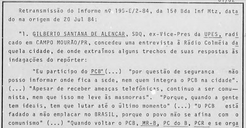 O historiador Jair Elias dos Santos Jr também achou no Arquivo Nacional uma "fichinha" do servidor Gilberto Santana de Alencar,de Campo Mourão. Ele virou alvo da ditadura militar em 20 de julho de 1984 por causa de entrevista à rádio Colmeia. Gilbertinnho se apresentou como militante do PCB (Partido Comunista Brasileiro), que na época era clandestino, e disse que a luta era por eleições diretas. O documento frisa que "o elemento distribui panfletos subversivos e picha muros em Campo Mourão".
