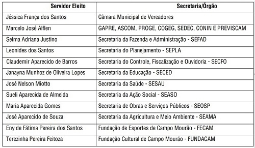A próxima segunda-feira é o Dia do Servidor, certo? Nem haverá expediente na prefeitua de Campo Mourão (exceto serviços essenciais e escolas). Nesta sexta-feira saiu o resultado da eleição do Servidor do Ano. São 12 funcionários, de setores diferentes, que serão homenageados. A lista está no quadro acima.