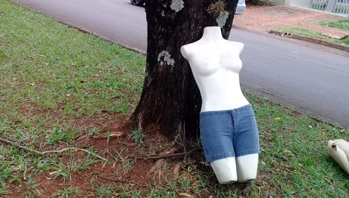 Manequim, de shorts, faz topless em canteiro central da av. Guilherme de Paula Xavier, perto da Coamo.