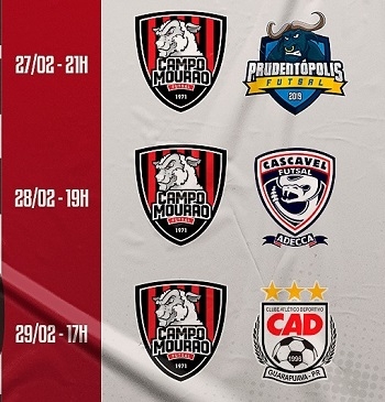 Campo Mourão disputa de quinta-feira a sábado, em Prudentópolis, a Copa Cachoeiras Gigantes de Futsal. É o primeiro torneio da pré-temporada. A estreia é contra os donos da casa (21h). Sexta pega o Cascavel (19h) e sábado o Guarapuava (17h).