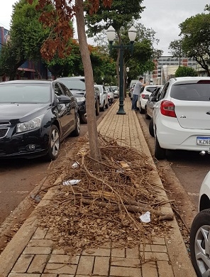 Galhos de árvore que estão há mais de 30 dias sobre o meio-fio em frente a Receita Estadual de Campo Mourão. Atrapalha os veiculos na hora de estacionar, pois não conseguem abrir a porta pelo lado do motorista.