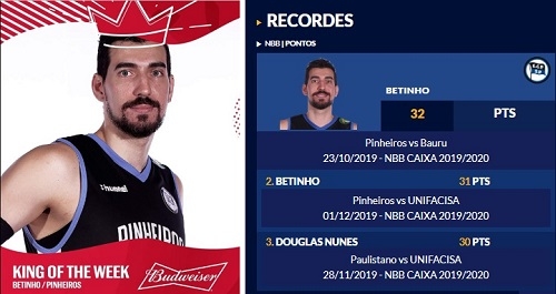 Está com saudades de ver Campo Mourão no NBB? Então não entre no site da Liga Nacional de Basquete que a saudade vai aumentar. Entre os destaques da temporada 2019/20, dois ex-mourãoenses lideram nos recordes de pontos por partida. Betinho (hoje no Pinheiros) já fez 32 pontos num jogo e 31 em outro. Douglas Nunes (Unifacisa) fez 30.