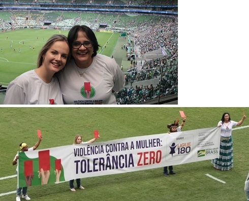 Olha quem esteve domingo no estádio do Palmeiras, em São Paulo. A mourãeonse Naiany Hruschka Salvadori, coordenadora de Políticas Afirmativas do Ministério da Mulher, Família e Direitos Humanos. E não foi pra ver o jogo contra o campeão Flamengo, não. Ela foi junto com a ministra Damares Alves fazer a campanha "Violência contra mulher - tolerância zero". Deram cartão vermelho para isso e tudo mais.