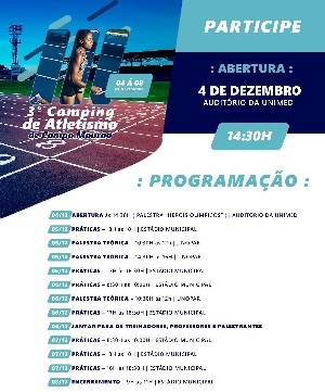 Acontece nesta quarta-feira (14h30), na Unimed, a abertura do 3º Camping de Atletismo de Campo Mourão. O medalhista olímpico Vanderlei Cordeiro de Lima e o vice-presidente da Confederação Brasileira de Atletismo, Wlamir Motta Campos, vão participar. O evento segue até domingo com palestras na Unopar e atividades práticas no estádio municipa.