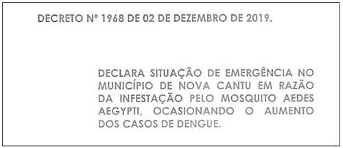 O prefeito José Carlos Gomes decretou situação de emergência em Nova Cantu por causa da epidemia de dengue.
