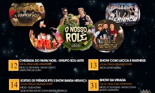 Em Boa Esperança, a programação do aniversário de 55 anos começou nesta quinta-feira, com a chegada do Papai Noel e espetáculo da Associação Sou Arte. Na sexta (22h) tem show com Lucca & Matheus em praça pública. No sábado, dia do aniversário, acontece o sorteio dos prêmios para quem pagou o IPTU em dia (15h) e show com banda Herança (22h).