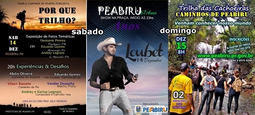Peabiru completa 67 anos de emancipação neste sábado. Para comemorar, três eventos foram marcados. Começa às 19h, na Casa da Cultura, com o "Por que trilho?". Haverá exposição de fotos e relatos de quem participou de caminhadas pelo mundo. Em seguida (23h), na praça central, tem show com o cantor Loubet. Pra terminar, domingo (8h) acontece a Trilha das Cachoeiras. Inscrições no site www.peabiru.pr.gov.br.