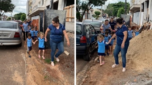 Alunos da escola Educare fizeram passeio nesta quinta-feira. Acabaram tendo uma aula de como não devem ser as calçadas.