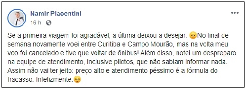 Lembra que o empresário Namir Piacentini foi um dos primeiros a usar a linha área Campo Mourão - Curitiba e rasgou elogios ao serviço? Até incentivou as pessoas que utilizassem o serviço. Isso é coisa do passado. O ex-deputado voltou a usar a linha e agora fez críticas no Facebook. Disse que o voo foi cancelado e teve de voltar de "busão" para a capital. Também reclamou da falta de informações.