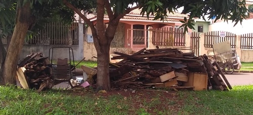 Entulhos e madeiras jogados no canteiro central na av. Guilherme de Paula Xavier, jardim São Sebastião.