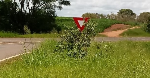 Trevo de Mamborê, mesmo pagando pedágio, tem placa de rodovia no meio do mato.