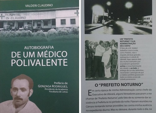 "Autobiografia de um médico polivalente". Esse é nome do livro lançado pelo médico Valderi Claudino, que foi prefeito de Ubiratã (1973/77). Na obra, ele conta que não queria ser candidato e que mesmo se elegendo passava o dia atendendo em seu hospital. Prefeitura? Só à noite. Por isso ficou conhecido como "prefeito noturno". Claudino mora atualmente na Paraíba. Ele é irmão do médico Francisco Claudino, de Campo Mourão.