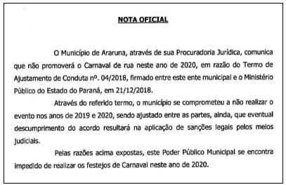 O texto diz que existe um acordo com o Ministério Público para que o município não promova o evento em 2019 e 2020.