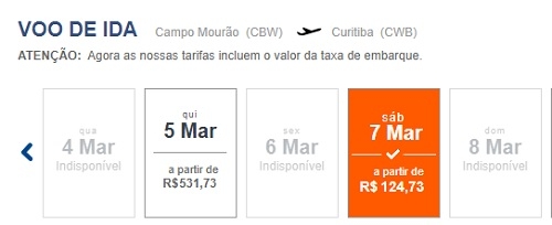 Será mais barato viajar de avião de Campo Mourão a Curitiba em março. Na maioria dos dias a passagem está disponível a partir de R$ 124,73. É o valor para os dias 7, 12, 19, 21, 24, 25, 28 e 31. Bem mais em conta que os R$ 531,73 da tarifa normal. Já quem foi viajar em 22 de fevereiro (sábado de carnaval) terá de desembolsar R$ 907,73.