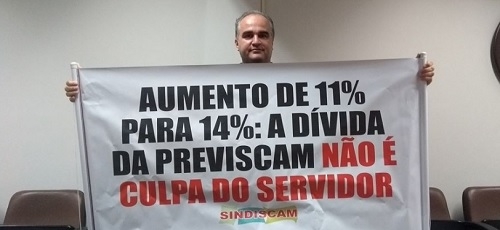 O Sindiscam levou faixas e cartazes destacando que a culpa do rombo da Previscam não é dos servidores.