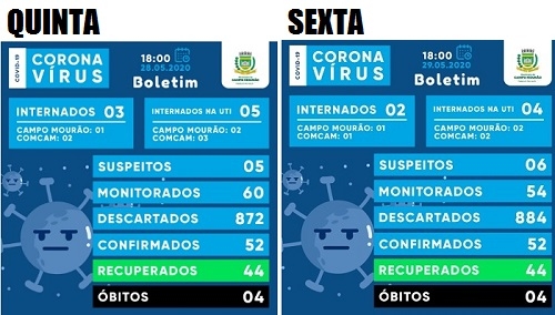 Nenhum caso de covid-19 foi confirmado nesta sexta-feira em Campo Mourão. Seguem 52. Também não houve recuperações, nem mortes. Os casos suspeitos foram de cinco para seis. Os pacientes internados diminuíram. Na enfermaria de três para dois e na UTI de cinco para quatro. Há um mourãoense na enfermaria e dois na unidade de terapia intensiva.