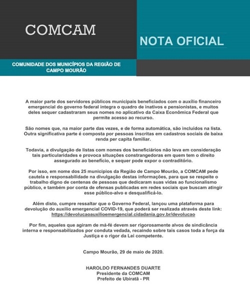 A Comcam divulgou "Nota oficial" sobre o caso de servidores municipais que receberam o auxílio emergencial.