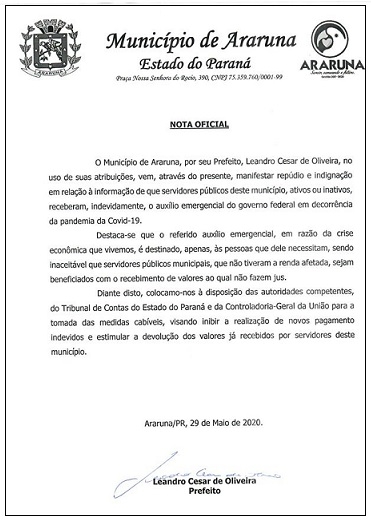 O prefeito de Araruna manifestou "repúdio e indignação" sobre servidores que receberam auxílio emergencial.