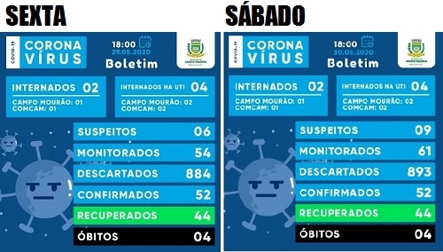 O boletim do covid-19 deste sábado em Campo Mourão quase não teve alterações em relação à sexta-feira. Seguem 52 casos confirmados e 44 recuperados. Os leitos ocupados também não mudaram - dois na enfermaria e quatro na UTI. O que mudou foi o número de casos suspeitos, que subiu de seis para nove.