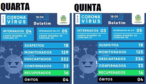 Poucas novidades no boletim da Covid-19 desta quinta-feira em Campo Mourão, o que é uma boa notícia. Os números de casos confirmados (33) e o de suspeitos (18) é o mesmo do dia anterior. Pelo menos não aumentou. Os pacientes internados na UTI (5) também. Já os pacientes na enfermaria diminuíram de quatro para três e os monitorados de 129 para 125. Recuperados (16) e óbitos (4) não tiveram alterações.