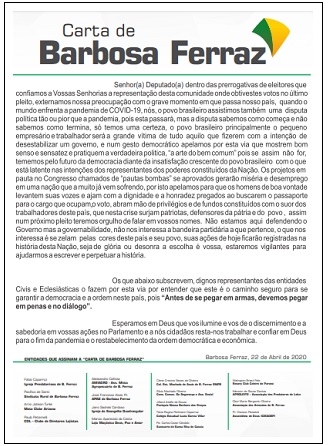 Entidades de Barbosa Ferraz divulgaram uma texto em que apelam para que o Congresso Nacional não vote (ou reprove) matérias da chamada "pauta bomba". A "Carta de Barbosa Ferraz" frisa que, se aprovados, essse projetos trarão "miséria e desemprego".