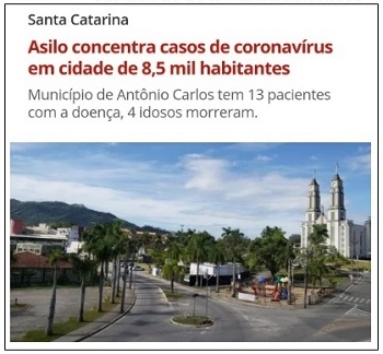 O portal G1 traz reportagem sobre a cidade de Antonio Carlos/SC. Com apenas 8,5 mil habitantes, o município tem 13 casos confirmados de Covid-19, com quatro mortes. Detalhe: 11 casos e todos os óbitos foram no asilo da cidade. Agora, repare na foto que ilustra a matéria que não é só o número de mortes por coronavírus que é igual a Campo Mourão.