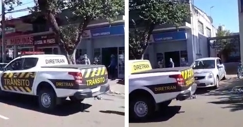 Vídeo postado em redes sociais mostra camionetona da Diretran, de Campo Mourão, parara em fila dupla na av. Capitão Índio Bandeira e ainda atrapalhando a saída de um carro da garagem.