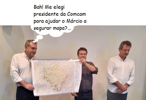 O clic é desta sexta-feira, durante a Caravana do ICMS Ecológico na sede da Comcam, em Campo Mourão. O secretário de Estado Márcio Nunes (Desenvolvimento Econômico) segurou o mapa com uma mãozinha do recém-eleito presidente da Comcam, Baco Duarte (Ubiratã).
