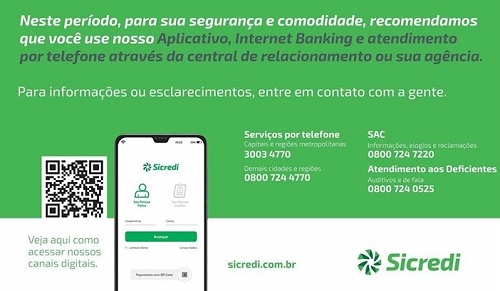 Os caixas automáticos seguem funcionando normalmente, porém a recomendação é que o associado procure o serviço nos horários de menor movimento e utilize o álcool em gel disponível no local. Os gerentes continuam à disposição por telefone e WhatsApp.