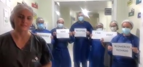 A equipe de UTI da Santa Casa de Campo Mourão gravou um vídeo sobre o combate ao coronavírus. "Viemos implorar que vocês fiquem em casa", disse a médica Bianca Galinari. "A gente entende o impacto na economia com o comércio fechado, mas a gente entende mais ainda do impacto na sua saúde e na sua vida". E concluiu: "Portanto, fiquem em casa, mantenham o comércio fechado".