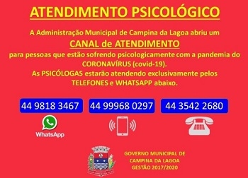 A prefeitura de Campina da Lagoa criou um canal de atendimento com psicólogos. É específico para quem estiver sofrendo psicologicamente com a pandemia do Covid-19. As psicólogas de atendem por telefone (fixo ou celular) e também por Whatsapp. O serviço funciona de segunda a sexta-feira, das 8h às 11h e das 13h às 16h30.