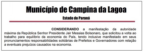 O decreto de ponto facultativo do comércio em Campina da Lagoa cita as manifestações do presidente Jair Bolsonaro (veja acima).
