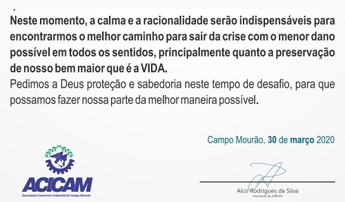 A Associação Comercial de Campo Mourão está preparando um plano de reabertura para o comércio de Campo Mourão.