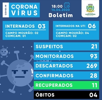 Depois de dois dias "zerados", Campo Mourão voltou a confirmar casos de Covid-19, que foram de 26 para 28. Em compensação, os suspeitos, que chegaram a 132, despencqram para 21 (eram 60 no dia anterior). Os recuperados subiram de nove para 11. Na UTI se manteve o mesmo número de leitos ocupados com o coronavírus: seis. Também não houve alteração no número de mortes (quatro).
