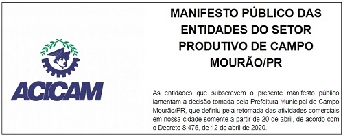 Trecho do manifesto divulgado por oito entidades empresariais de Campo Mourão, que lamenta decisão da prefeitura e pede a reabertura imediata do comércio.