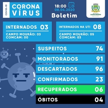 Mais um caso confirmado de Covid-19 nesta quarta-feira em Campo Mourão. Ou seja: agora são 23. Os recuperados foram de cinco para seis. Na UTI há oito pessoas, cinco da cidade e três da região. O número de suspeitos explodiu: de 36 para 74. E isso que segunda-feira eram 17. Parte disso se deve a exames que passaram a ser feitos no pessoal da saúde.