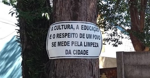 Parece que alguém se irritou com a constante colocação de lixo e entulho em calçada da rua Araruna, perto da av. Capitão Índio Bandeira, centro de Campo Mourão. Olha só a placa que foi colocada na árvore. "A cultura, a educação e o respeito de um povo se mede pela limpeza da cidade", diz o aviso.
