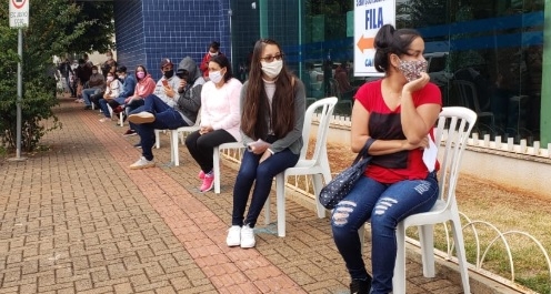 A prefeitura de Campo Mourão levou 220 cadeiras nesta terça-feira para pessoas que estavam na fila da agência central da Caixa Econômica. O banco tem recebido muita gente em busca do auxílio emergencial liberado pelo governo federal. A fila, literalmemte, dobra o quarteirão. As cadeiras pertecem à prefeitura.