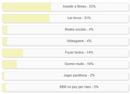 Em tempos de quarentena o melhor a fazer é... assistir filmes! Pelo menos foi essa a alternativa que venceu a enquete de Boca Santa, encerrada neste domingo. Teve 32% dos votos. Se bem que foi apertadinho. "Ler livros" fechou com 31%. "Fazer faxina" (14%) e "dormir muito" (10%) vieram em seguida. O resultado completo está no quadro acima. Agora, cá pra nós: Só 3% foram o pay per view do BBB20?...