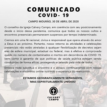 Igreja Calvary Campo, de Campo Mourão, em comunicado divulgado nesta quinta-feira, sobre continuarem suspensos os cultos e encontros presenciais. "Cremos em uma fé racional, cívica e responsável que opera através do amor a Deus e ao próximo", destaca.