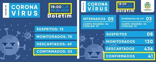 Boletim divulgado nesta quinta-feira pela prefeitura de Campo Mourão mostrou 41 casos confirmados de Covid-19 no município. Você lembra quantos eram há um mês? Boca Santa foi aos arquivos em busca da resposta. Em 30 de março Campo Mourão tinha três confirmações. Ou seja, de lá pra cá a média foi de 1,2 novo registro de coronavírus por dia.