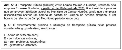 A partir desta segunda-feira morador de Luiziana não pode nem pensar em pegar a circular par ir passear ou fazer compras em Campo Mourão. Só poderá embacar quem for trabalhar. É o que diz decreto do prefeiro Mauro Slongo que saiu depois da confirmação do segundo caso de coronavírus na cidade. Grupos de risco também não embarcam. Além disso, o busão só saíra uma vez rumo a Campo Mourão, pela manhã, com retorno no fim da tarde.