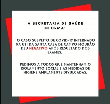 Desde quinta-feira, quando foi divulgado que um morador de Quinta do Sol tinha sido internado na UTI Covid da Santa Casa de Campo Mourão, a população fricou apreensiva com o possível primeiro caso na cidade. Neste sábado, no entanto, a Secretaria Municipal de Saúde usou as redes sociais para dizer que o resultado do exame no paciente deu negativo. Assim, Quinta do Sol segue zerada, inclusive sem casos suspeitos.