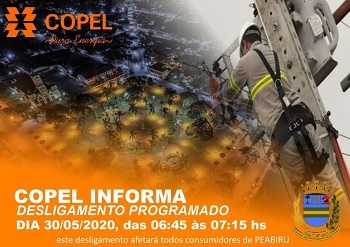 Peabiru ficará sem energia elétrica no próixmo sábado. Será por meia hora - das 6h45 às 7h15. "Este desligamento afetará todos consumidores", alerta a Copel. Motivo? "Troca de isolador na barra de 13,8kV na SE Peabiru".