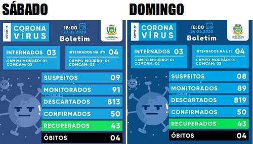 O boletim divulgado neste domingo mostra mais um dia sem casos confirmados de covid-19 em Campo Mourão. Foi o sétimo dia seguido. O município segue com os mesmos 50 registros do domingo anterior. Também não houve alteração no número internados na enfermaria (3) e na UTI (4). Já os casos suspeitos caíram de nove para oito.