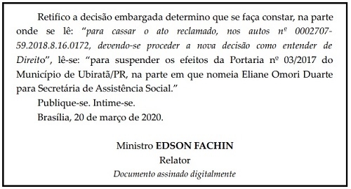 A decisão do ministro Edson Fachin é de 20 de março, após pedido da Ong Vigilantes da Gestão Pública.