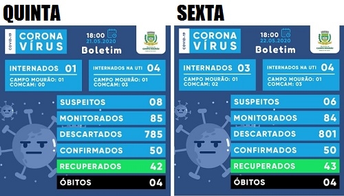 Pelo quinto dia seguido não houve novos casos de coronavírus em Campo Mourão. São os mesmos 50 de domingo. Melhor: o boletim divulgado nesta sexta-feira mostra mais um caso recuperado (agora são 43). Os suspeitos caíram de oito para seis. Os internados na enfermaria subiram de um para três (chegaram dois de Goioerê). A UTI segue com quatro leitos ocupados.