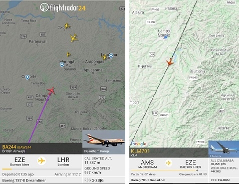 E o tráfego aéreo sobre Campo Mourão começa a voltar, devagar mas está voltando. Na primeira foto um avião que partiu da Argentina com destino a Londres. Na segunda, avião que partiu de Amsterdam (Holanda) rumo a Buenos Aires, ambos na tarde desta quarta-feira. Márcio