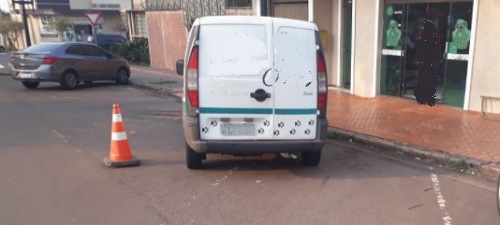 "Não bastasse o cone "segurando" uma vaga, o veículo ainda ocupa duas no centro de Campo Mourão. Onde estão as autoridades que fiscalizama esse tipo de infração?"